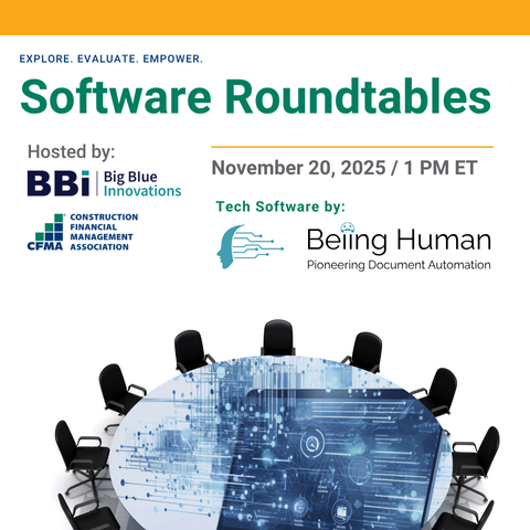 Join BBI and CFMA for an interactive virtual roundtable featuring Beiing Human. This roundtable is designed to give construction financial professionals a direct line to software vendors in a sales-free, education-focused setting. Attendees will gain practical insight into the software’s capabilities, ask questions, and evaluate how well the solution aligns with their business needs. Please note: BBI and CFMA do not endorse or promote any software vendors participating in this series.